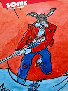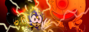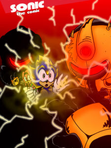 Sonic’s battle with the terrifying Chaos creature was going badly until Ebony showed up with her friend, Super Sonic. Super had split from Sonic and had become a pacifist, never daring to use the terrible power that the chaos energy bestowed upon him.